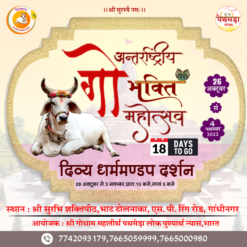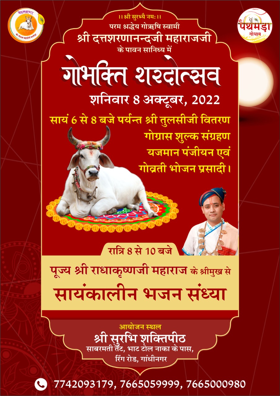 लोक प्रसिद्ध गोसेवा संस्थान श्री गोधाम महातीर्थ पथमेड़ा के संस्थापक श्रद्धेय गोऋषि स्वामी श्री दत्तशरणानंदजी महाराज के पावन सानिध्य में आयोजित गोभक्ति शरदोत्सव महोत्सव के मंगल अवसर पर 7 अक्टूबर को सायं 8 बजे से परम गोवत्स श्री राधाकृष्णजी महाराज के मुखारविंद से भजन संध्या का आयोजन किया जा रहा है। आप सभी गोभक्त अधिकाधिक संख्या में पधारें।
