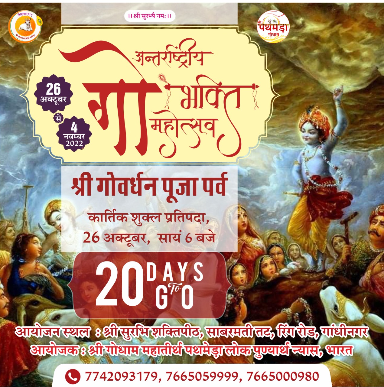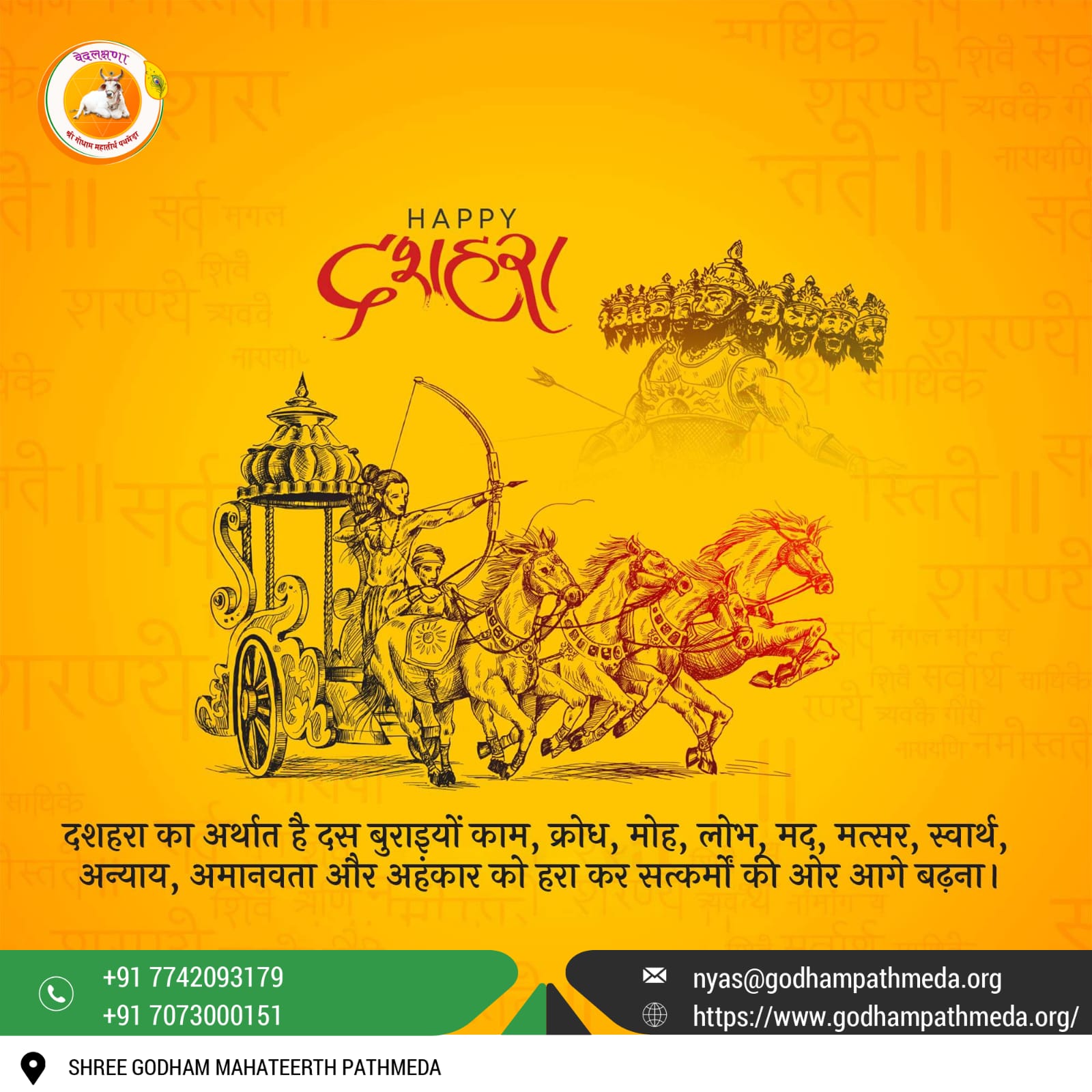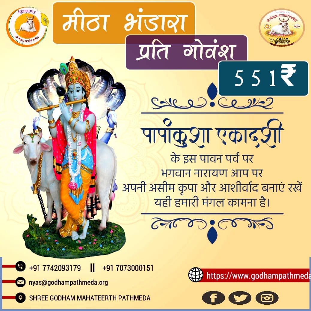 आप सभी गोप्रेमियों से सादर निवेदन है कि आज* ( श्री पापांकुशा एकादशी ) के शुभ अवसर पर आप सभी श्री गोधाम महातीर्थ पथमेड़ा में सेवा व चिकित्सा प्राप्त कर रहे लम्पी स्किन डिजीज से ग्रसित , गंभीर बीमार व दुर्घटनाग्रस्त गोवंश को दवाई , पेयजल , लापसी , बाजरी , जौ , अनाज , सूखे चारे , पौष्टिक आहार अथवा हर यथासम्भव सहयोग अवश्य प्रदान करवाएं ।
