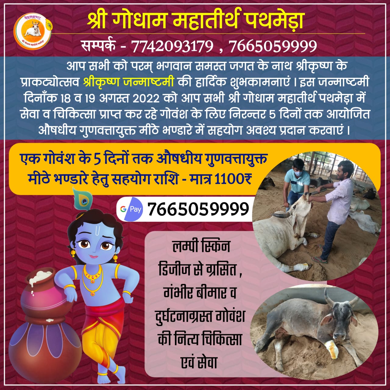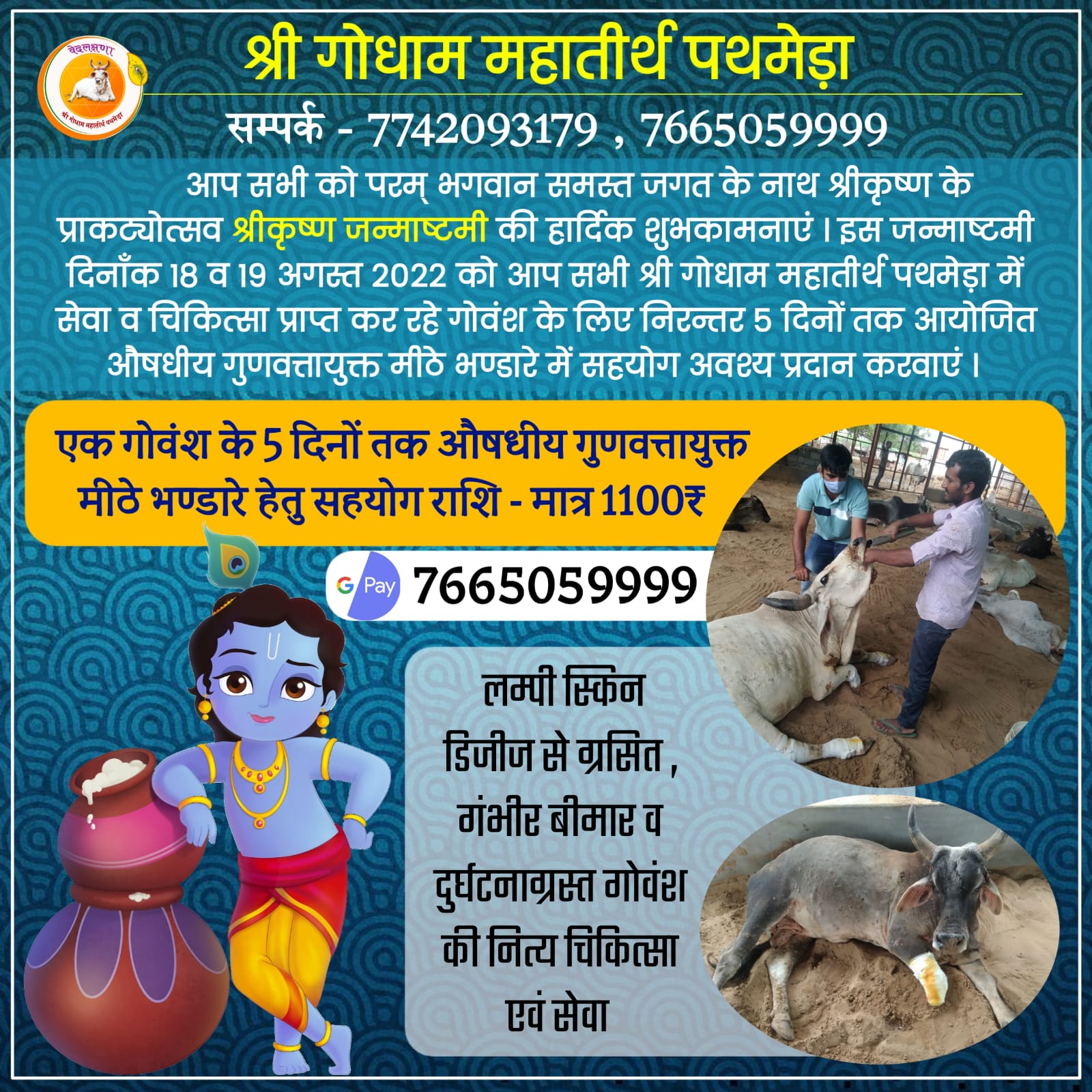 श्री गोधाम महातीर्थ पथमेड़ा की गोसेवा गतिविधियों की विशेष जानकारी हेतु संपर्क करें:
